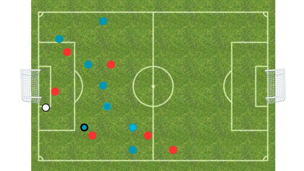 Sin embargo, aunque la decisión de Sommer fue clave, también había otras opciones viables que podrían haber funcionado igual de bien. En este caso, el pase final de Sommer fue hacia un jugador que, aunque cubierto, podía recibir el balón y descargar hacia una posición más adelantada. Pero, en mi opinión, también habría sido una opción viable pasar el balón al otro jugador que he marcado con borde azul cian. Este jugador estaba totalmente libre y tenía suficiente espacio para girarse y avanzar rápidamente, lo que habría permitido una transición aún más fluida y directa hacia el ataque.